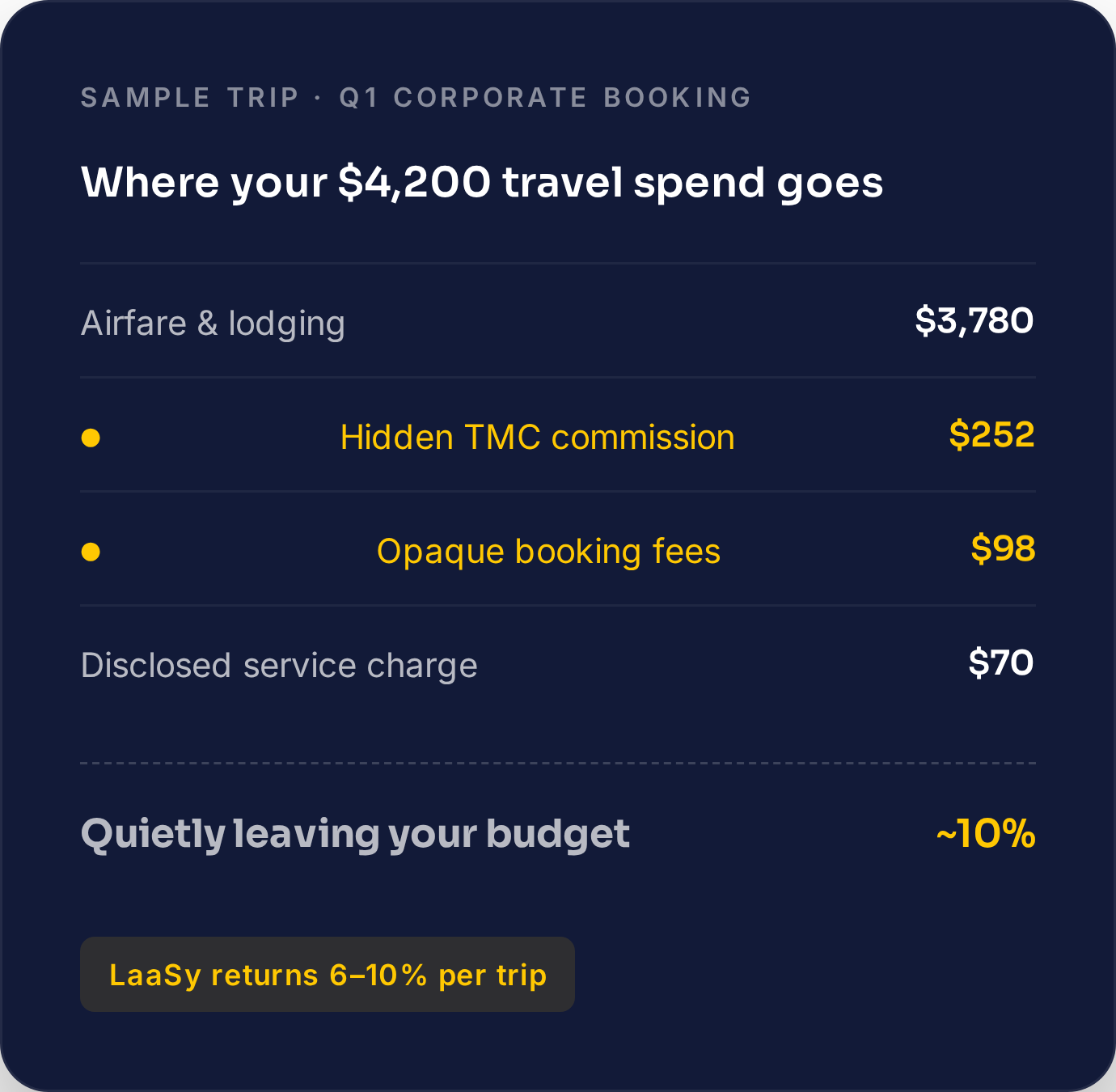 LaaSy Business Travel re-architects the transaction. Every commission, every fee, every supplier rebate — surfaced, documented, and shared back with the company that paid for the trip in the first place.