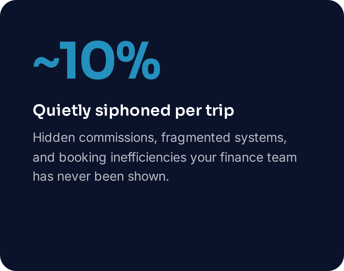 Corporate travel has been treated as a fixed cost. It isn't. Roughly 10% of every dollar quietly flows out of your organization and into the coffers of legacy travel platforms — through commissions, opaque fees, and contracts written to keep the second revenue stream hidden.
